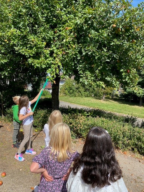 Kinder des 2. Schuljahres haben sich zunächst auf Entdeckungsreise gemacht, um herauszufinden wie viele Apfelbäume auf dem Gelände der Schule zu finden sind. Nachdem drei Apfelbäume entdeckt wurden, stand die Verköstigung der Äpfel an. Nur die leckersten Äpfel sollten in den zu backenden Muffins ihre Verwendung finden. Das Votum der Kinder fiel eindeutig auf einen Baum mit zwar eher kleinen, dafür aber recht süßen Früchten. Mit einem Obstpflücker wurden anschließend die schönsten Exemplare geerntet. Eine mit Kurbel betriebene Apfelschäl- und schneide Maschine begeisterte die Kinder und auch bei der Zubereitung des Muffin Teiges waren die Kinder mit großem Eifer dabei, so dass zum Abschluss der Betreuungszeit 100 gesunde Vollkorn Apfel Muffins an alle Kinder und Erwachsene verteilt werden konnten.